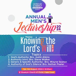 Church of Christ, Esuekyir-Cape Coast, presents the Annual Men’s Lectureship 2024, themed “Knowing the Lord’s Will” (Ephesians 5:17). This event is designed to train and encourage men on sound doctrine, enabling them to defend the faith as urged in Jude 3. The lectureship also aims to educate the men in the Lord’s church to hold onto sound doctrine and maintain the purity of the church.